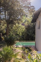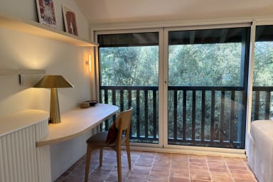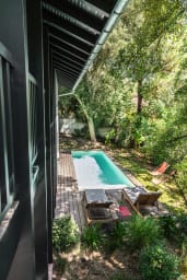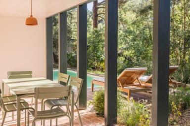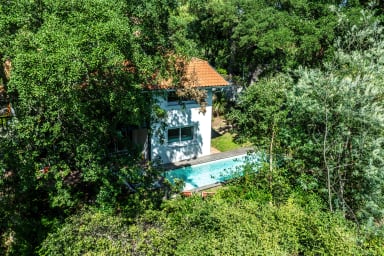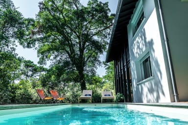 Son design épuré et minimaliste, son mobilier sobre et créé sur mesure, ses couleurs claires et ses matériaux naturels, en font une maison élégante et lumineuse, élaborée avec goût. Cette villa a été pensé comme une cabane dans les arbres. Vous aurez une vue à 180 degrés sur la végétation qui l'entoure.