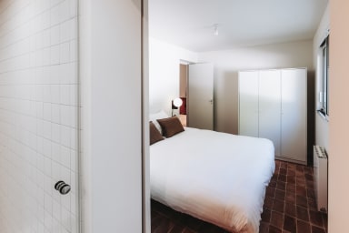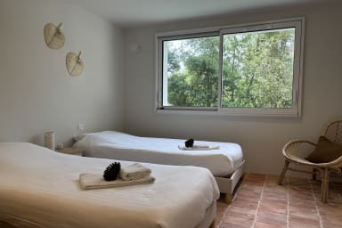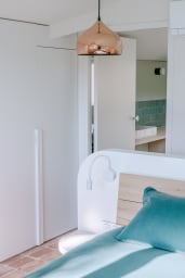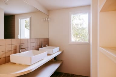 Vous trouverez 2 suite parentales vous offrant une intimité et un confort optimal. Au rez de chaussée se trouve 1 chambre pour adulte ou enfant, avec 2 lits simples pouvant être mis en lit double (160x200) , 1 chambre dortoir et une salle de douche avec un meuble double vasque, dans un esprit brut-chic qui résume l’atmosphère de la villa.