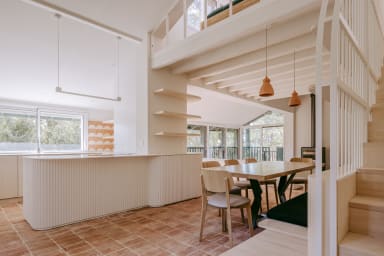 La pièce à vivre se compose d'un salon, d'une salle à manger avec banquette pour plus de convivialité et d'une cuisine au couleurs douces et clairs. Vous accéderez depuis ce niveau à une terrasse nichée dans les arbres afin de vous réunir autour d'un verre pendant les longues soirées d’été. Une seconde terrasse plus intimiste avec un coin repas disposant d'une plancha et au bord de la piscine vous permettra de partager de beaux moments de convivialité.